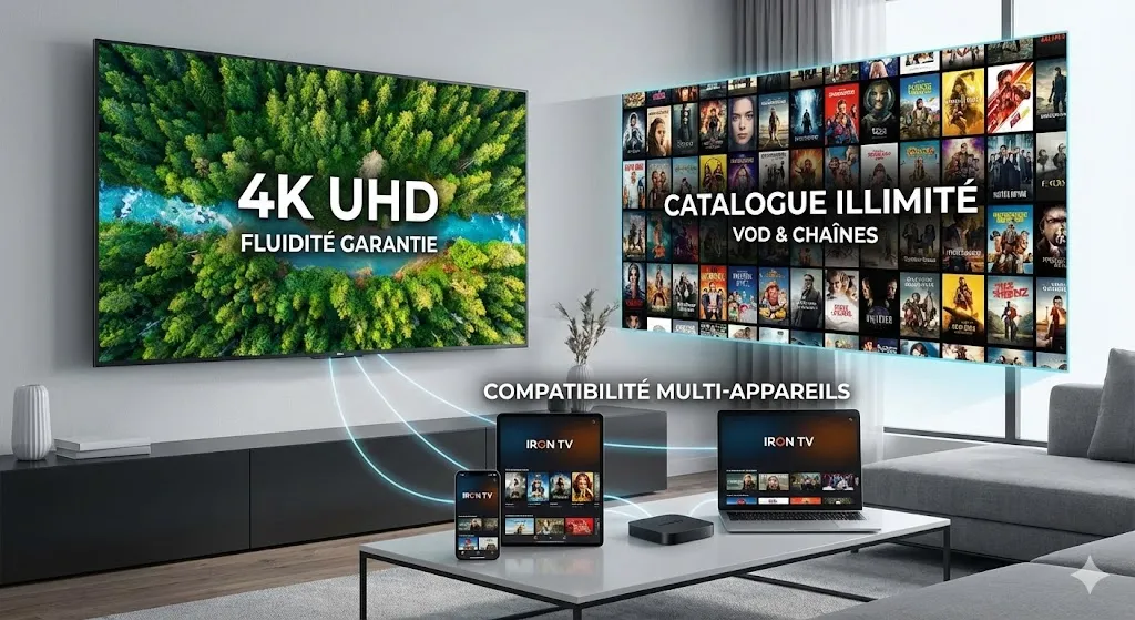 Multiplier les abonnements aux différentes plateformes de streaming vidéo à la demande (VOD) représente un budget mensuel conséquent. L’avantage majeur d’une solution centralisée réside dans le regroupement de milliers de chaînes internationales et d’un vaste catalogue de films et séries au sein d’une seule interface. C’est ici que l’optimisation de votre budget intervient : en appliquant le Code promo Iron TV Pro 2026 lors de votre inscription, vous accédez à un divertissement illimité tout en réalisant des économies substantielles sur le long terme. Pour optimiser encore plus votre installation, n’hésitez pas à lire notre guide complet sur le choix des meilleurs boîtiers de streaming.