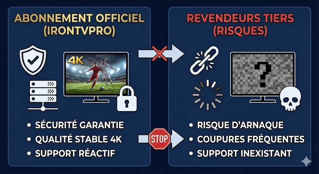 Il est tentant de chercher le Iron TV Max prix le plus bas possible sur le web, mais attention aux arnaques. De nombreux revendeurs non officiels proposent des tarifs dérisoires mais offrent un service médiocre : coupures fréquentes lors des grands matchs, support inexistant, ou coupure de l’abonnement après quelques semaines.